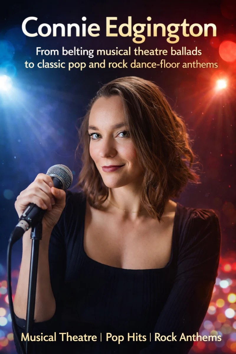 With a powerful voice and infectious stage presence, Connie's repertoire spans everything from belting musical theatre ballads to classic pop and rock dance-floor anthems. Her cabaret performances combine vocal strength, warmth and charisma, creating an electric atmosphere that gets audiences singing along and on their feet.