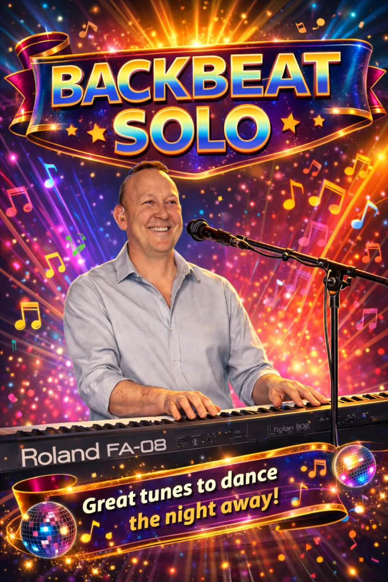 Highly adaptable, Dave tailors each performance to suit the venue and occasion - whether it's a lively party, wedding, corporate event, or relaxed pub setting. Known for his reliability and professional approach, Backbeat Solo delivers quality live entertainment with seamless setup, great sound, and an engaging stage presence.