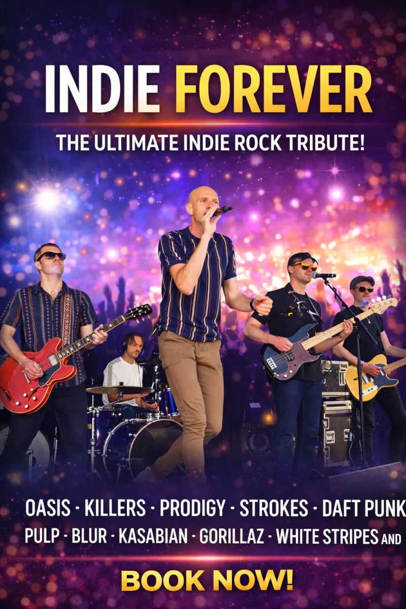 The Best Brit Pop & Indie Floor Fillers performed live. Featuring massive anthems from the likes of Oasis, The Beatles, The Kings of Leon, Faithless, David Bowie, The Killers, The Prodigy, The Strokes, Daft Punk, Faithless, Pulp, Blur, Kasabian, Gorillaz, The White Stripes and more.
