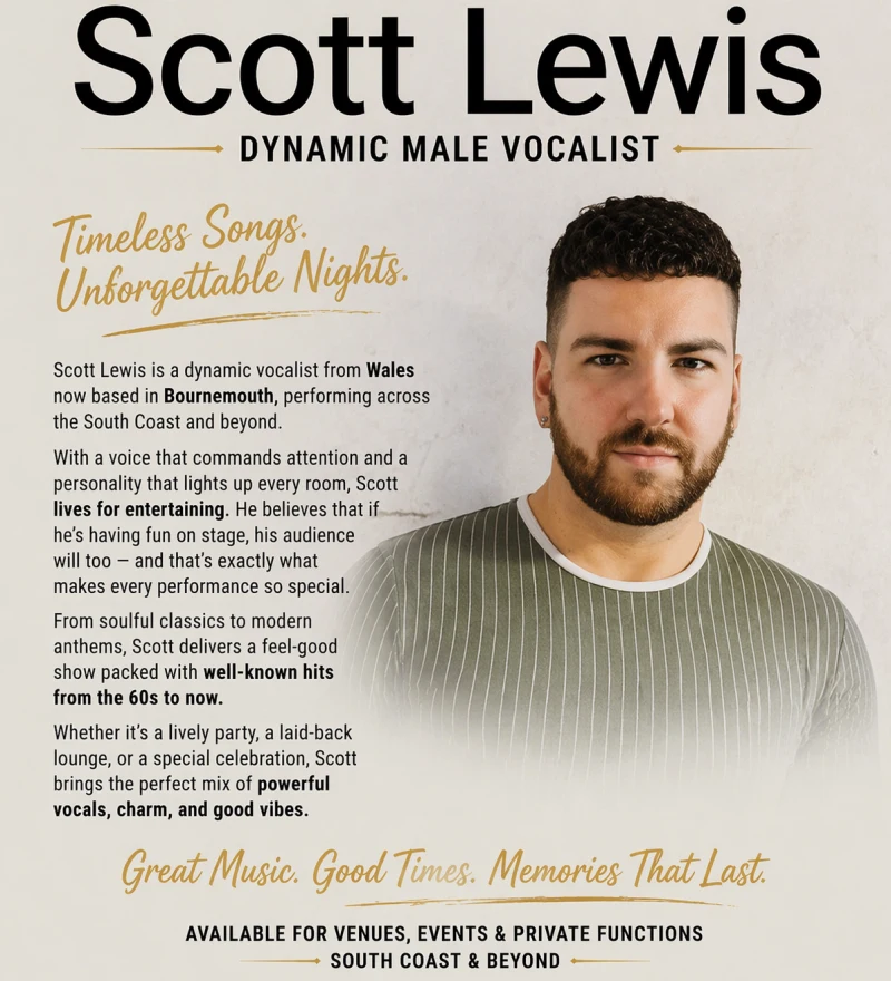 Scott Lewis is a dynamic vocalist from Wales, now based in Bournemouth and performing across the South Coast and beyond. With over 12 years of performing experience, Scott brings a wealth of talent, confidence, and professionalism to every show.
